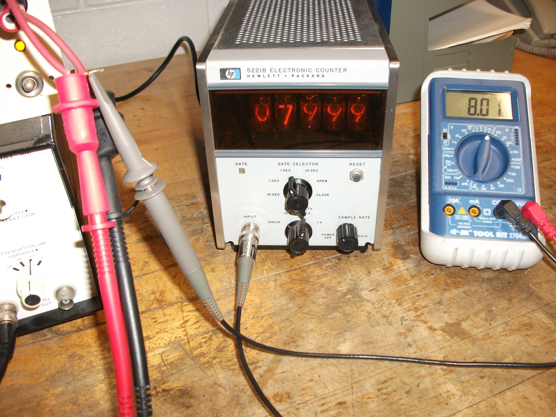 Old nixie-tube display counter and multimeter frequency meter were used